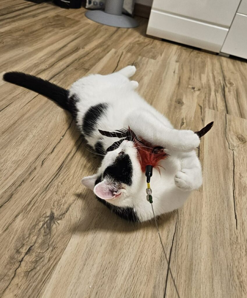 Die ehemalige Katzenhausbewohnerin Flöckchen hat bei ihrer Familie schon große Fortschritte gemacht. Zwar versteckt sie sich noch gerne, spielt aber schon fleißig und kann sehr laut schnurren.