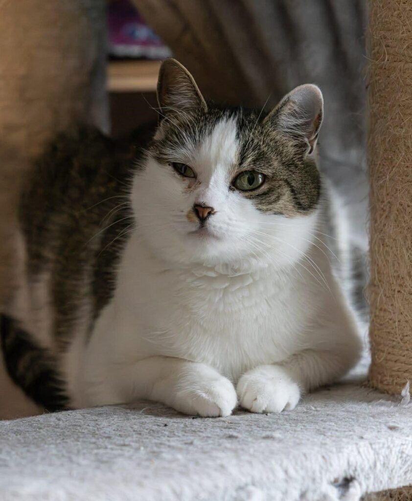 Als Jungkatze kam sie mit Katzenschnupfen zu uns. Der Schnupfen wurde Gott sei Dank komplett geheilt, nur ein Auge hat etwas zurückbehalten. Durch die vielen Medikamentengaben in der Anfangszeit wurde Astrid sehr misstrauisch. Sie lässt sich von ihren Vertrauenspersonen zwar streicheln, aber das hat lange gedauert und Fremden traut sie nicht über den Weg, weshalb sie, sobald potenzielle Adoptanten das Zimmer betreten, immer unsichtbar ist, und das, obwohl die soziale, fast 3-Jährige so viel Potenzial mitbringt und sich sicher gut als Zweitkatze eigenen würde oder bestimmt auch gut in eine Katzengruppe integrierbar ist.