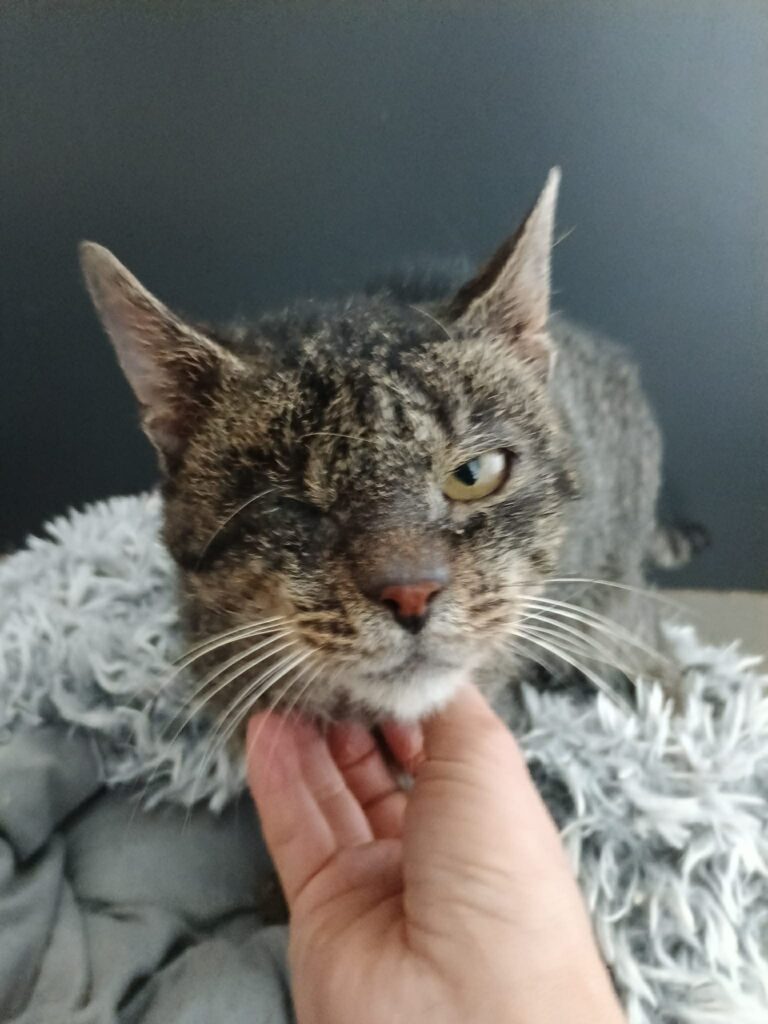 Was war das für ein Anblick, als wir Freddy das erste Mal gesehen haben, total verwahrlost, abgemagert, komplett verschnupft, voller Flöhe und Milben und doch so zutraulich, so anhänglich, gutmütig, lieb und dankbar. Freddy ist eine Seele von Katze, der leider gezeichnet vom Leben ist. Wohl durch den massiven Ohrmilbenbefall dürfte er komplett taub sein, ein Auge hat er wahrscheinlich durch den Katzenschnupfen verloren. Weiters ist sein Kopf schief gestellt, wir haben gehofft, durch die Behandlung der Ohrmilben da noch eine Verbesserung zu erzielen, doch leider ist sie minimal. Der zutrauliche, menschenfreundliche Freddy ist dadurch doch sehr eingeschränkt, braucht daher unbedingt ein Platzerl mit kontrolliertem Freigang. Auch das Klo-Training war anfangs herausfordernd, er braucht zumindest zwei Katzenklos – zu seiner Verteidigung, ein Katzenklo hatte er sicher sein ganzes Leben zuvor noch nie gesehen, wohl ebenso wie ein Bett oder volle Futterschüsseln.